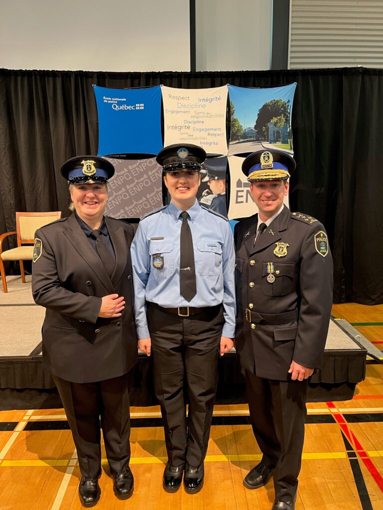 Lors de cette cérémonie protocolaire, la lieutenante Josée Forest, du Service de la Sécurité publique de la MRC des Collines-de-l’Outaouais a eu le plaisir de remettre à sa fille, Jade Legros, son attestation de fin d’études. Jade qui était déjà à l’emploi du SPMDC depuis 2020 à titre de répartitrice au Centre d’appels d’urgence devient du même coup policière et travaillera peut-être même sur la même équipe que sa mère. Il n’est pas rare que des pères ou des mères remettent une attestation à leur fils, mais qu’une mère remette le tout à sa fille est beaucoup plus rarissime.